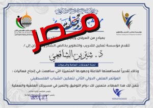تكريم الإعلامية شيرين الشافعي لدورها في تمكين الشباب الفلسطيني ودعم القضايا العربية